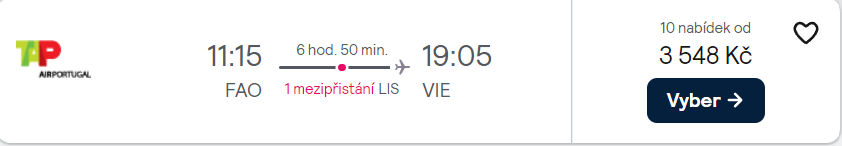 Pokud budete někdo moc moc spěchat, tak je let hned ráno v pondělí 14.10., TAP Portugal, Faro – Lisabon – Vídeň