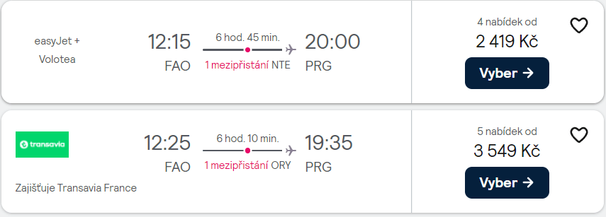 Pokud spěcháte a potřebujete letět už 14.10 zpět do Prahy, zde jsou 2 nabídky s přestupem v Nantes nebo Paříži.